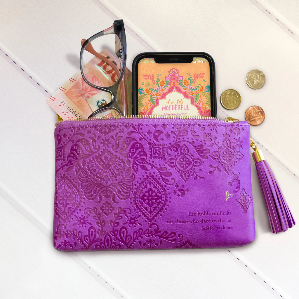 Crafted in a bright magenta, soft vegan leather with a positivity-packed phrase inspiring you to dare to dream as life holds no limits. More than just a pouch for cards, keys and cash, this stylish on-the-go accessory is big enough to fit your phone or sunglasses too! Or why not use it as a make-up bag or mini pencil case?!