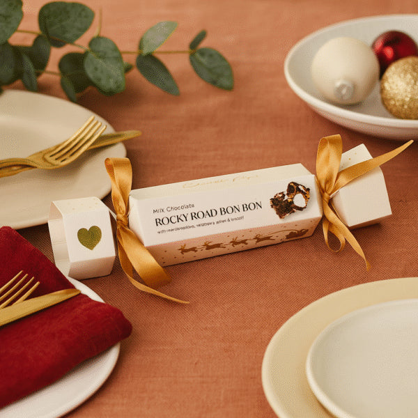 Indulge in the delectable delight of Biscoff Rocky Road Cracker Milk Chocolate. Each decadent 100g bar is a heavenly mix of rich, creamy milk chocolate, crumbled Biscoff biscuits, fluffy marshmallows, and tangy raspberry jellies. The irresistible rocky road texture and a symphony of the flavours make it impossible to resist. Packaged in a festive bonbon-shaped box, it's perfect for gifting or savouring with family and friends.