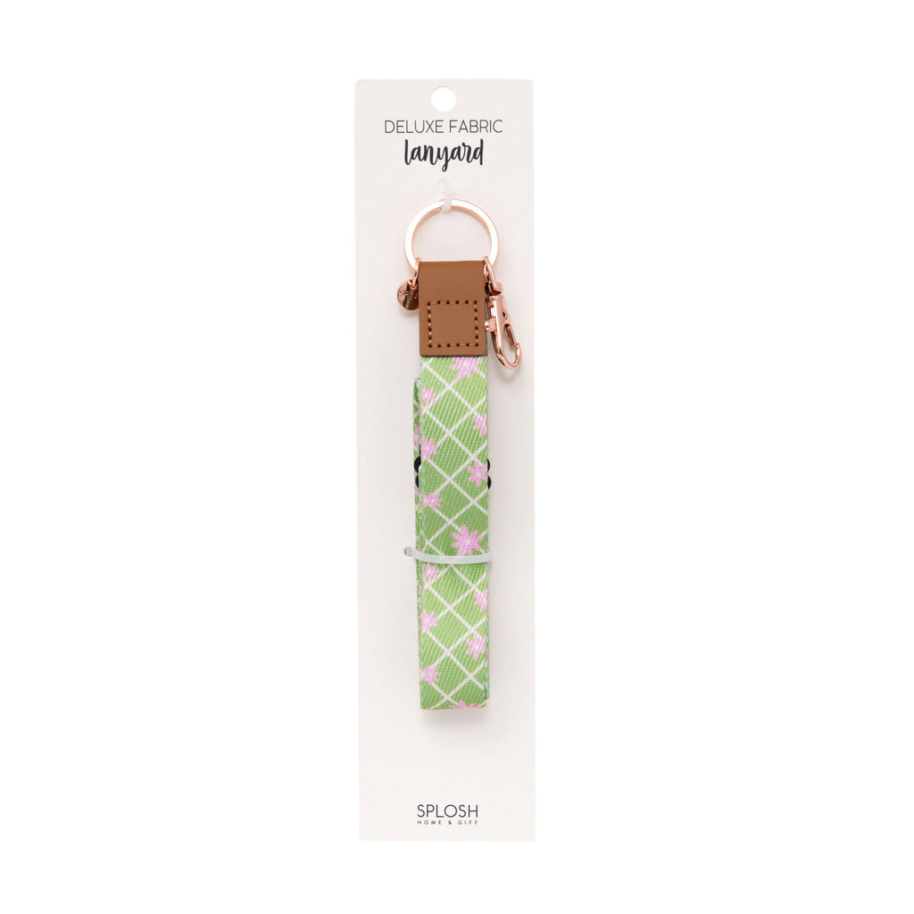 Fabric printed lanyard with choke safety clip and rose gold accessories.