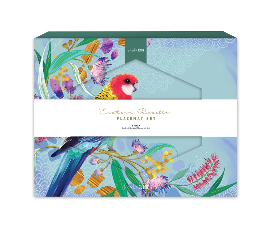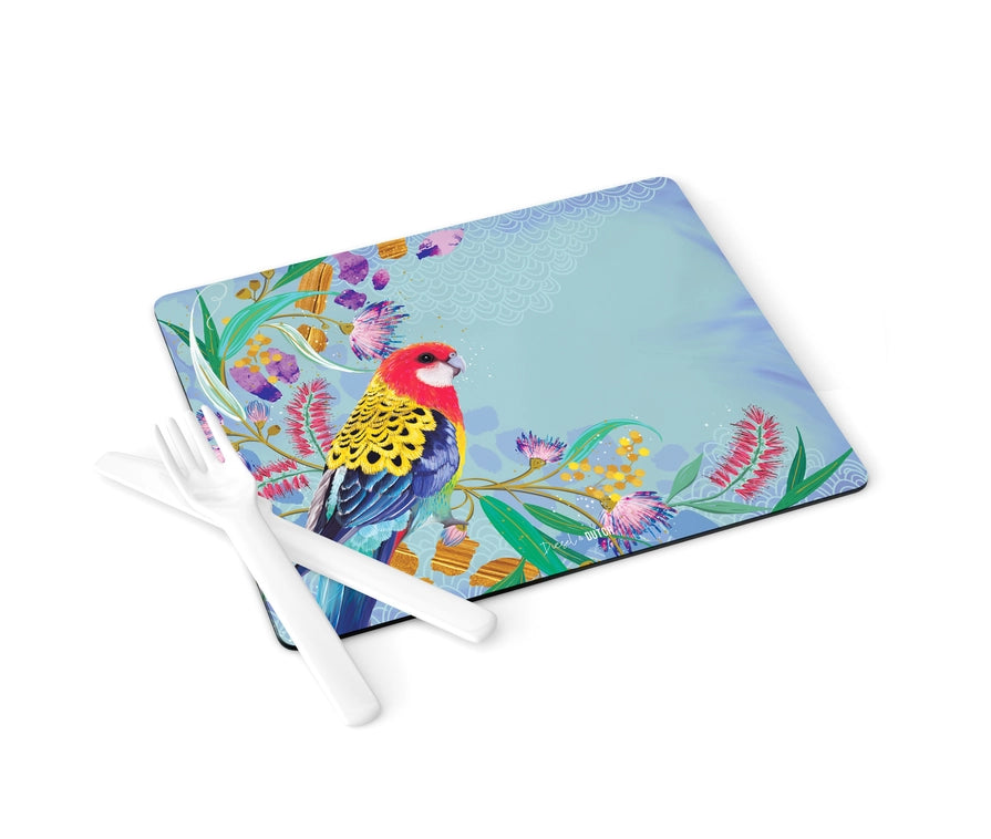 This set of 4 corked backed placemats features the much loved and ever cheeky Eastern Rosella perched high up in a flowering tree. These placemats will sit well on both indoor and outdoor dining tables to brighten the mood in any space.