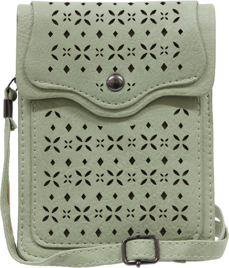 Introducing the Belle x Body bag... Crafted from luxurious materials with delicate laser cuts and a front pocket, this unique design will have you standing out in any crowd. Featuring a magnetic closure and adjustable cross body strap for added convenience, it's the perfect addition to your collection.