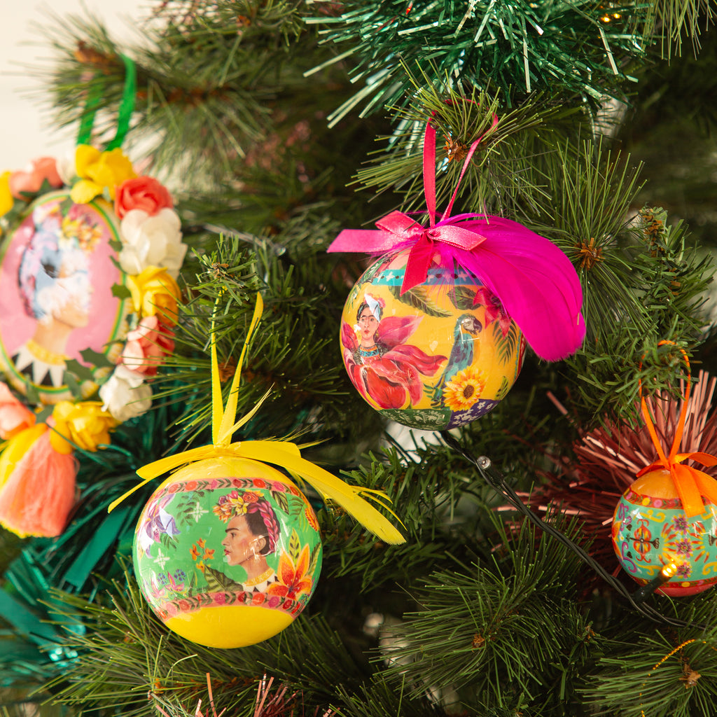 Add the essence of Frida Kahlo and Mexican culture to your Christmas tree with our Viva La Vida Bauble Set. Each of these artistic baubles, are a celebration of colour and creativity. With illustrations inspired by Frida Kahlo herself, this set of 6 lightweight baubles comes with vibrant multi-coloured fluffy feathers and ribbons for easy hanging and a decorated gift box for storage. Make your Christmas decor truly enchanting with the Viva La Vida Bauble Set.