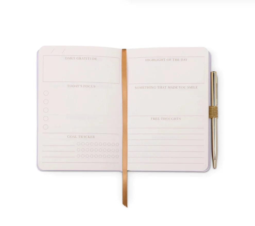Cultivate a practice of kindness with the our Gratitude Journal and Pen. This gratitude journal includes 196 guided interior pages to assist you in your mindfulness journey. Easily find the time to unwind and reflect with prompts for daily thoughts, goals, and gratitude. Includes a ribbon marker so you never lose your place and a pen so you are always prepared to document the day. This small journal is easily packed in a carry-on, purse, or backpack to stay on track through trips and travel.